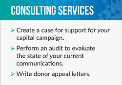 Alongside its partner Foster Avenue, Marts & Lundy can also help your nonprofit evaluate its campaign communication abilities, develop its case statement, develop your campaign brand, and more.