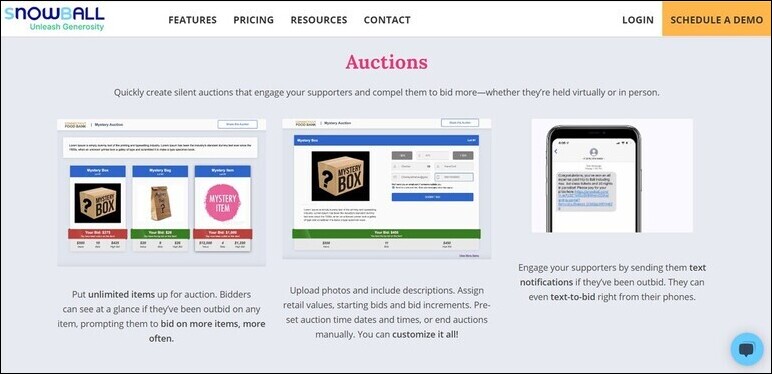 Snowball Fundraising is an online fundraising platform with several software packages to choose from—including silent auction software! Their auction software builds upon their existing framework of affordable and user-friendly fundraising tools, including online giving pages, text-to-give functionality, and more.