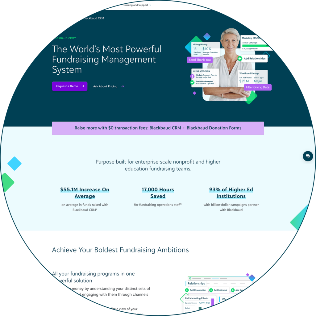 A screenshot of the Blackbaud CRM product page.