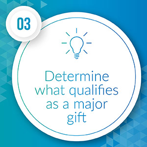 Additionally, when a major donor gives to your organization, they expect to see tangible outcomes from their contribution. They also might expect perks in exchange for their gift. Establish how you’ll report major gift results and what incentives you’ll offer with your team so they can communicate them clearly to prospects.