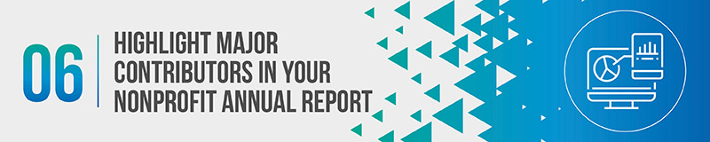 In addition to showcasing your nonprofit’s success, your annual report is also about thanking those who helped you achieve those goals. The best way to do this is by listing out and thanking your major donors, board members, and organizational leadership.