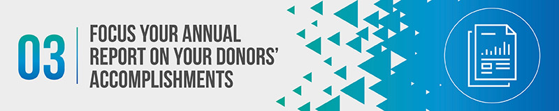 In addition to discussing your supporters’ accomplishments generally, set aside space in your annual report to draw extra attention to the supporters who went above and beyond for your cause. Besides the customary list of major donors and the initiatives they supported, consider including stories about some of these donors or other individuals who have been especially impactful to your cause, such as a loyal volunteer or a long-serving board member.