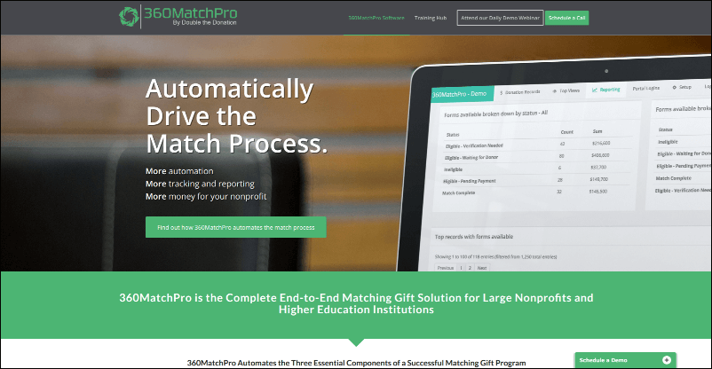 Double the Donation‘s software solution, 360MatchPro, is a comprehensive, fully automated matching gifts platform that pushes forward the identification, follow-up and match completion process for you. 360MatchPro offers three pricing plans: the Small Nonprofit plan starting at $999/year, the Standard plan starting at $2,500/year, and the Enterprise plan that includes custom pricing.