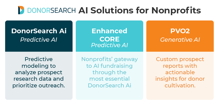 DonorSearch is also a leader in nonprofit fundraising intelligence. Our AI offerings include: