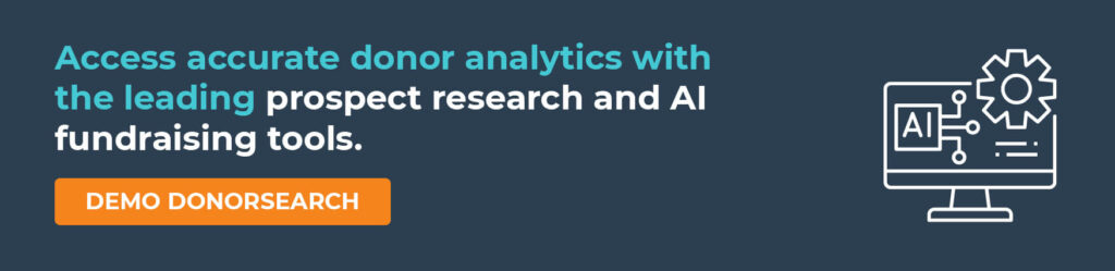 Reliable nonprofit AI and prospect research tools are critical for effective predictive analytics. Although no software can perfectly project donors’ future actions, the more robust your solutions are and the higher the quality of your data, the better you’ll be able to use these analytics to streamline major donor outreach and cultivation.