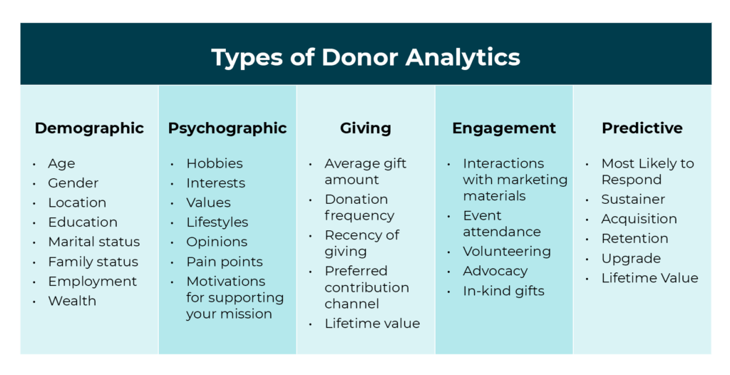 With all of the data your nonprofit collects on its donors, how do you determine what analytics are actually useful for your strategy? While every organization’s needs will be different, we’ve broken the most common donor analytics into the following five categories so you can review their applications and decide which ones you should focus on.