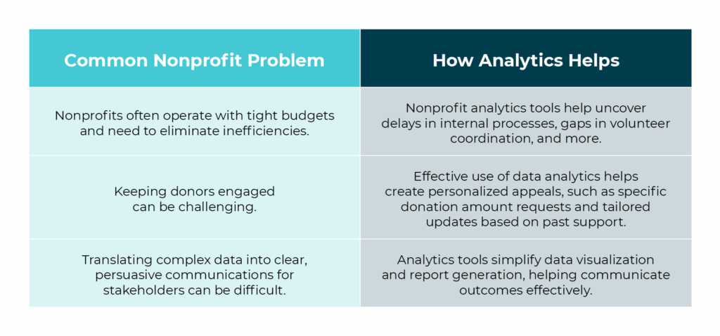 Nonprofits grapple with several key challenges that limit their effectiveness. Fortunately, smart use of data analytics can address these issues head-on—let’s look at a few common scenarios as examples.