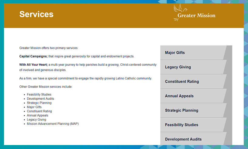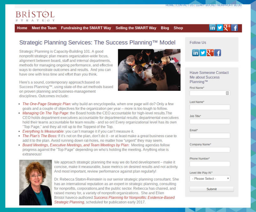 In addition to these consulting services, the Covenant Group also offers a four-party online program called the Strategic Planning Roadmap Process to guide nonprofits and churches through strategic growth campaigns on their own.