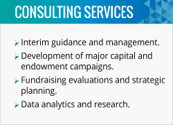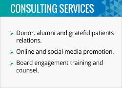 • Annual giving, alumni relations, and grateful patient fundraising counsel